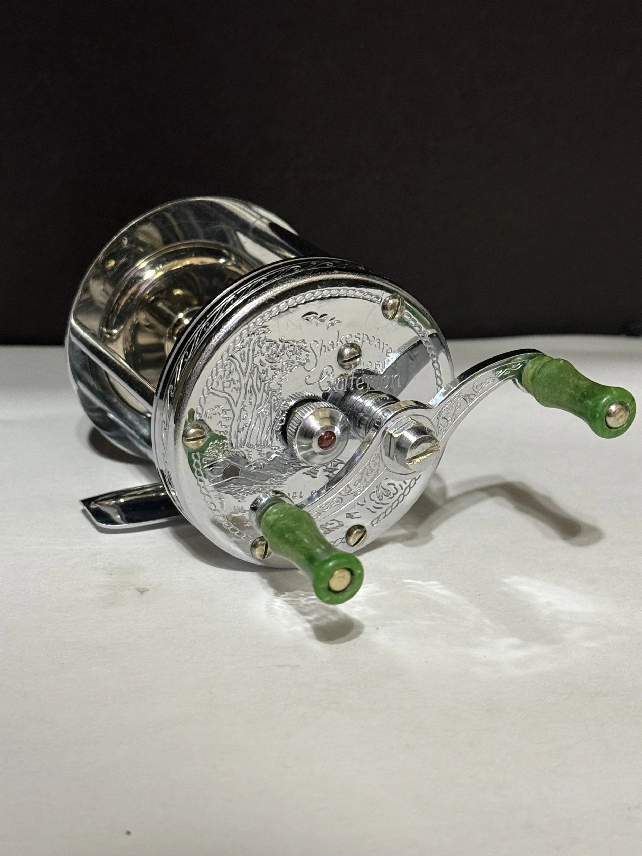 Shakespeare CRITERION No. 1961 Model HE Circa -1936. This reel features a spectacular engraved fishing scene on both front and back plates and is considered a Shakespeare favorite. The reel is in perfect working order and is in very fine condition. The engraved handle with the green grips are both beautiful, spin extremely free and just seem to make this reel sparkle. The foot is free of any defects and clearly shows patented and made in the USA underneath.